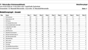 Am 18. und 19.April 2026 fanden im Stadionbad in Neustadt an der Weinstraße die 31. Weinstraßen-Schwimmwettkämpfe statt. Am Start waren mehr als 550 Aktive aus mehr als 35 Vereinen und Startgemeinschaften, darunter auch einundzwanzig Aktive unseres Vereins.